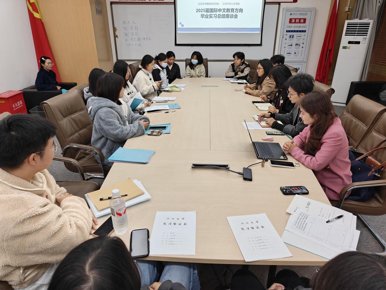 近日,汉语言文学专业 2025 届本科毕业实习总结会在国际教育学院107会议室召开。会议由国际中文教育系陈澜老师主持,复盘 6 周实习工作,国际教育学院张燕副院长、袁钰主任以及人文学院中文系副主任邓斯博和国际中文教育方向20名实习生参会。
