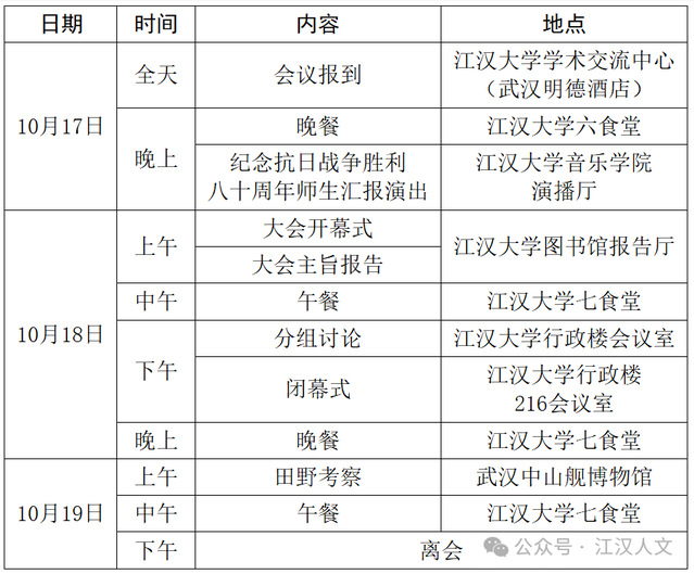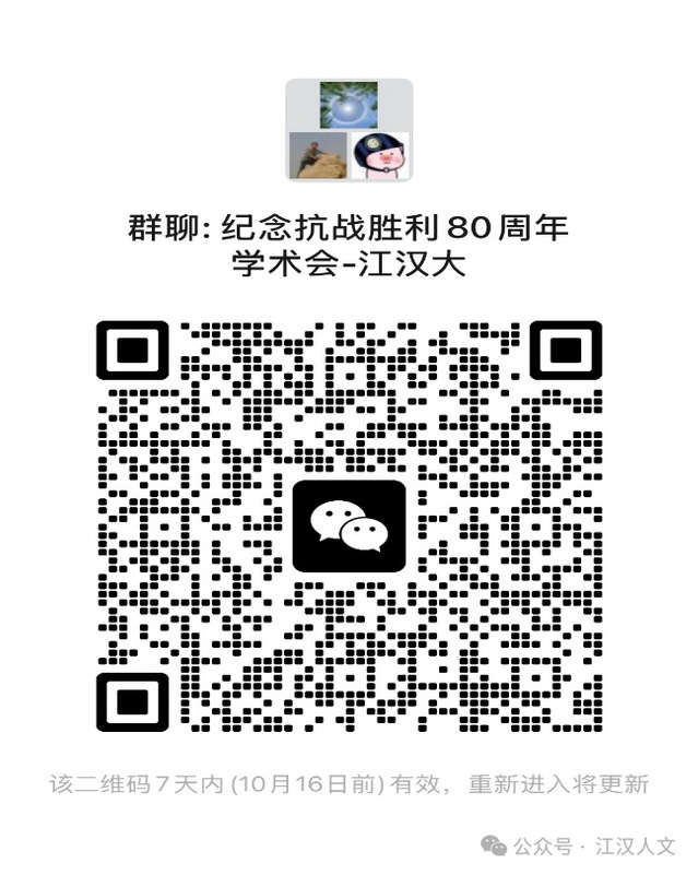 2025年10月17-19日,中国社会科学院中日历史研究中心、华中师范大学中国近代史研究所、中国现代文化学会区域文化专业委员会、中国史学会城市史专业委员会、江汉大学城市研究中心将联合在武汉举办“区域、国家和全球视野下的武汉抗战与世界反法西斯战争学术研讨会”。自会议通知发布后,得到学界同仁的大力支持。经专家匿名评审,72篇论文入选本次研讨会。特诚邀作者参会,共襄学术盛举。兹将会议有关事项敬告如下: