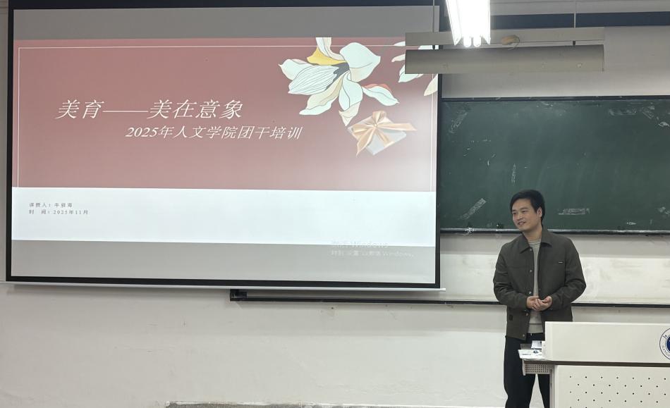 11月14日,牛新海老师在J02A101以“美育,美在意象”为专题授课。从传统诗词“明月寄情”、古典绘画“远山含黛”切入,阐释“意象是美的灵魂”,强调美育是“发现美、感知美、创造美”的品格涵养路径;并结合团学工作实际,提供美育与活动策划结合的案例,为学生活动注入美学内涵。