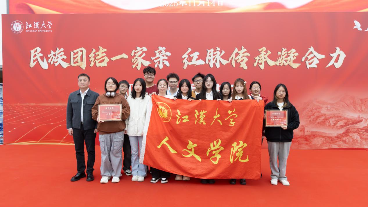2025 年 11 月 14 日,江汉大学 “民族团结一家亲 红脉传承凝合力” 知识竞赛圆满落幕。人文学院积极组织学生参与,经初赛、复赛选拔,选派张婉、熊馨桐、薛银慧、王佳敏等4位同学组队参加决赛。团队凭借扎实的知识储备与默契配合,最终获得二等奖,学院获评 “优秀组织单位”。