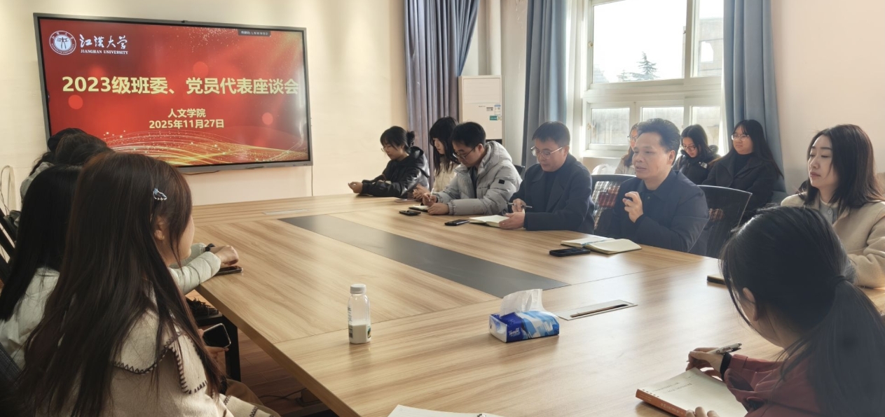 11月27日,人文学院召开班委、党员代表座谈会,学院党委书记赵友法、党委副书记梅坤,学生工作办公室主任刁晨希、辅导员姜维以及23级各班主要班委、党员代表参加。