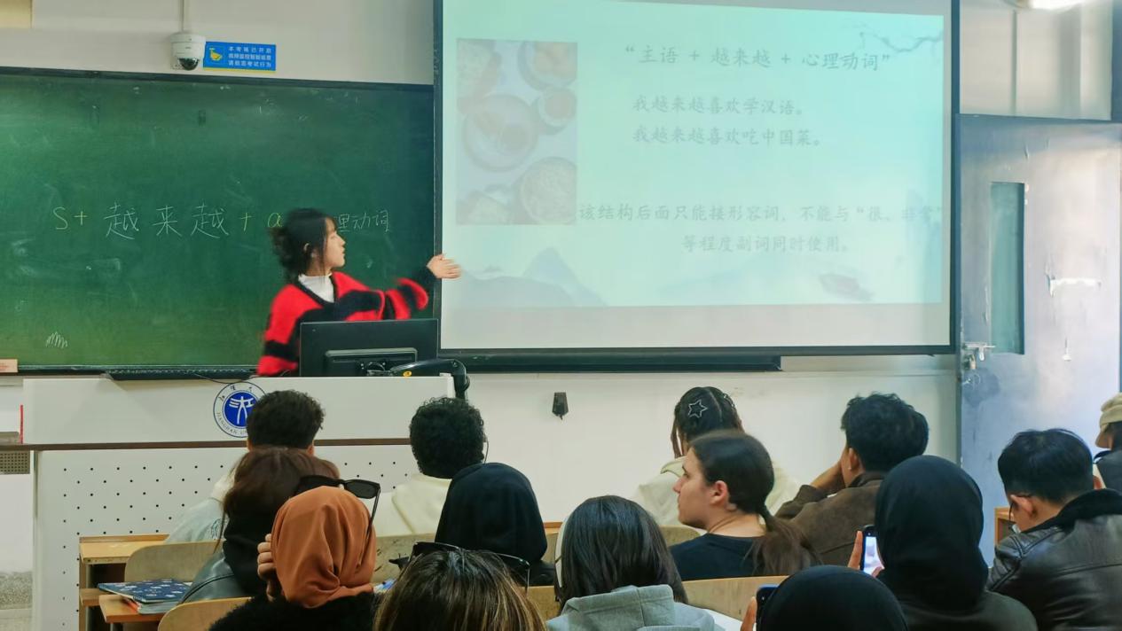近期,华言对外汉语志愿者服务团队在J02B202教室开展HSK3语法辅导活动,吸引留学生积极参与。