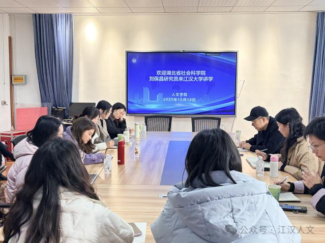 2025年12月18日,湖北省社会科学院研究员刘保昌应邀在江汉大学人文学院J02B402开展专题讲座,讲座主题为“人文社科类科研选题与研究方法”。江汉大学研究生院院长庄桂成教授、人文学院院长张贞教授、学院学术骨干、青年教师代表参加本次学术活动,讲座由院长张贞主持。